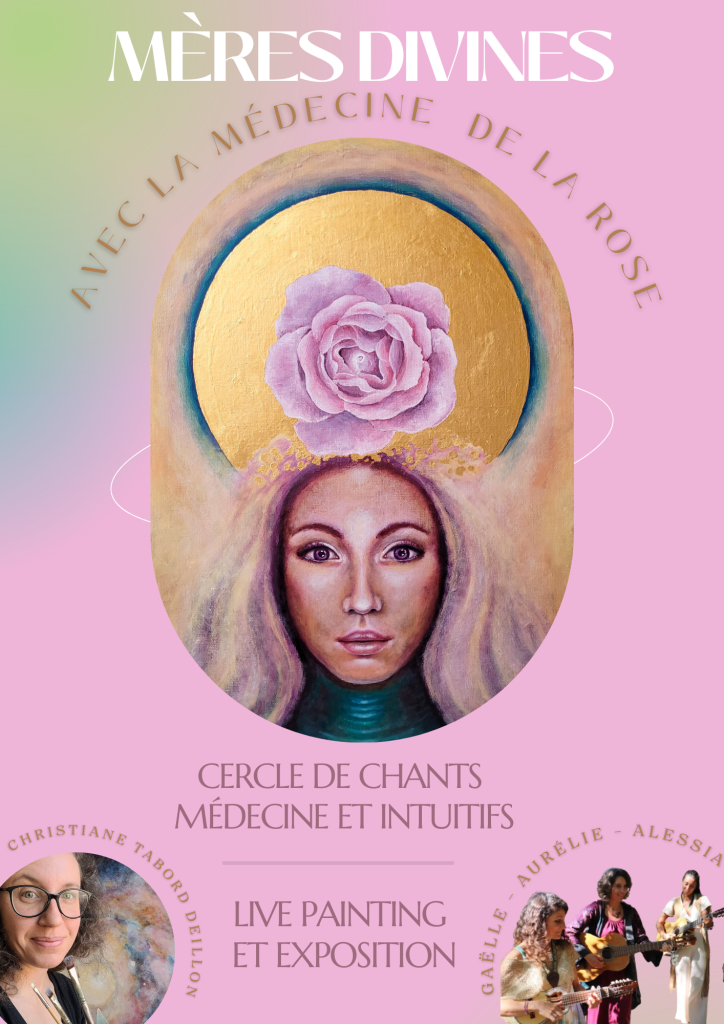 Une création sublime est née de mon amitié avec Aurélie Foretay et Alessia Savino, deux très belles musiciennes. Ensemble, nous avons crée cet atelier / cercle de chants mettant à l’honneur le Féminin Sacré et les Mères Divines. Notre amie peintre Christiane expose ses portraits des Mères et nous offre la réalisation d’une oeuvre en live, se laissant inspirer par les énergies de grâce du cercle.